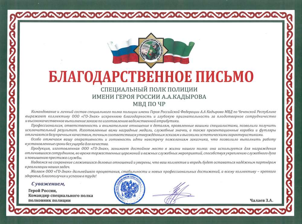 Благодарственное письмо от специального полка полиции им. Героя России А.А. Кадырова