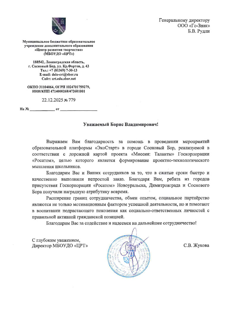 ГлавнаяКлиентыОтзывыБлагодарственное письмо от МБОУДО "ЦРТ"