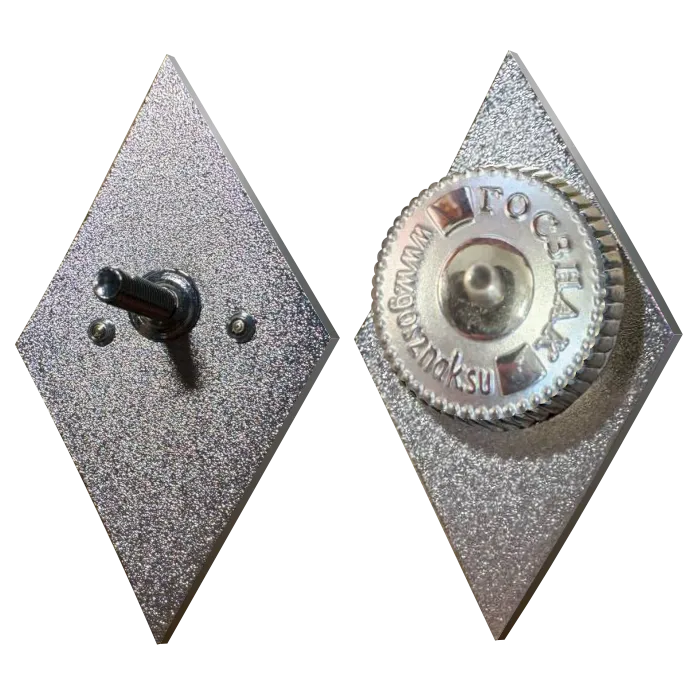 Высота знака — 55мм, варианты крепления — безопасная булавка или традиционный винт.